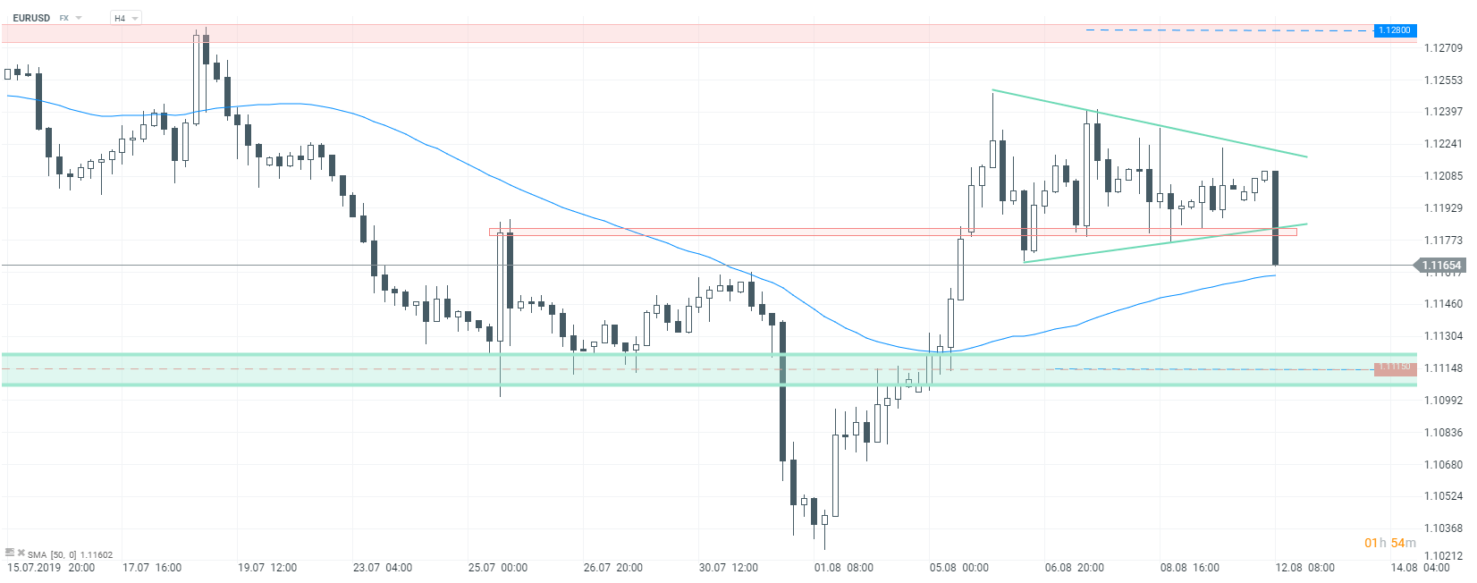 - EURUSD wraca poniżej 1,1200, wybijając dołem z formacji trójkąta