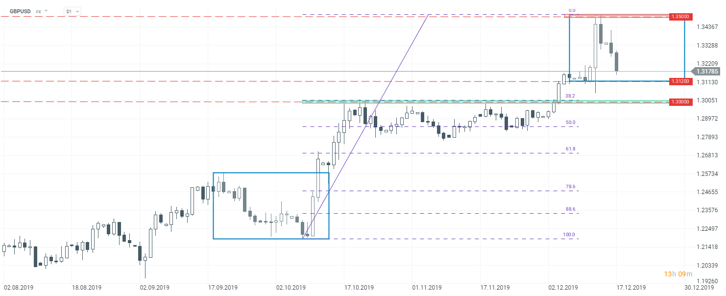 Po danych z godziny 10:30 obserwujemy pogłebienie spadków na kursie GBPUSD. Jeżeli obecny sentyment się utrzyma, istnieje spora szansa na atak wsparcia przy 1,3120. Poziom ten wynika z dolnego ograniczenia układu Overbalance z interwału D1, jest to największa korekta w całym ruchu wzrostowym, który obserwujemy od września tego roku. W przypadku obrony, będzie to dobre miejsce do wygenerowania kolejnej fali wzrostowej. Z drugiej strony, zanegowanie układu powinno się przełożyć na spadki w rejony 1,3000.