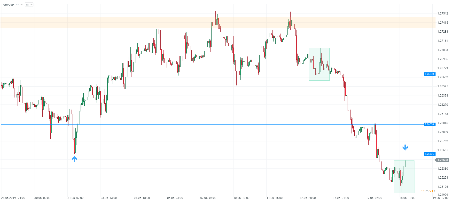 Kurs GBPUSD dociera do ważnego poziomu technicznego. Patrząc na interwał H1, cena testuje właśnie wybite wcześniej minima z 31 maja 2018 roku. Jeżeli zobaczymy powrót poniżej górnego ograniczenia układu 1:1, to spadki mogą być kontynuowane. Wtedy też celem dla sprzedających będzie zejście na nowe minima. Ewentualne zanegowanie poziomu 1,2560, będzie świadczyć o złamaniu tendencji spadkowej i możliwej większej korekcie wzrostowej.