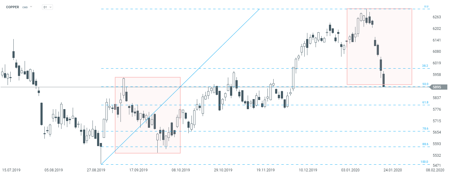 Podczas dzisiejszej sesji mamy do czynienia z kontynuacją przeceny na miedzi, co ma związek z rozprzestrzeniającym się chińskim koronawirusem (Chiny są bowiem głównym importerem tego surowca, a rosnące obawy o sytuację w kraju mogą zmniejszyć zapotrzebowanie na miedź).