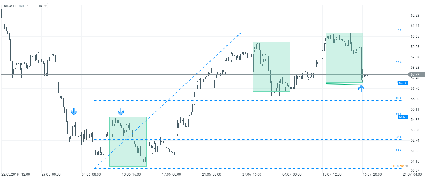 Notowania ropy WTI bronią wsparcia wynikającego z mierzenia 38,2% oraz geometrii 1:1. Źródło: xStation5