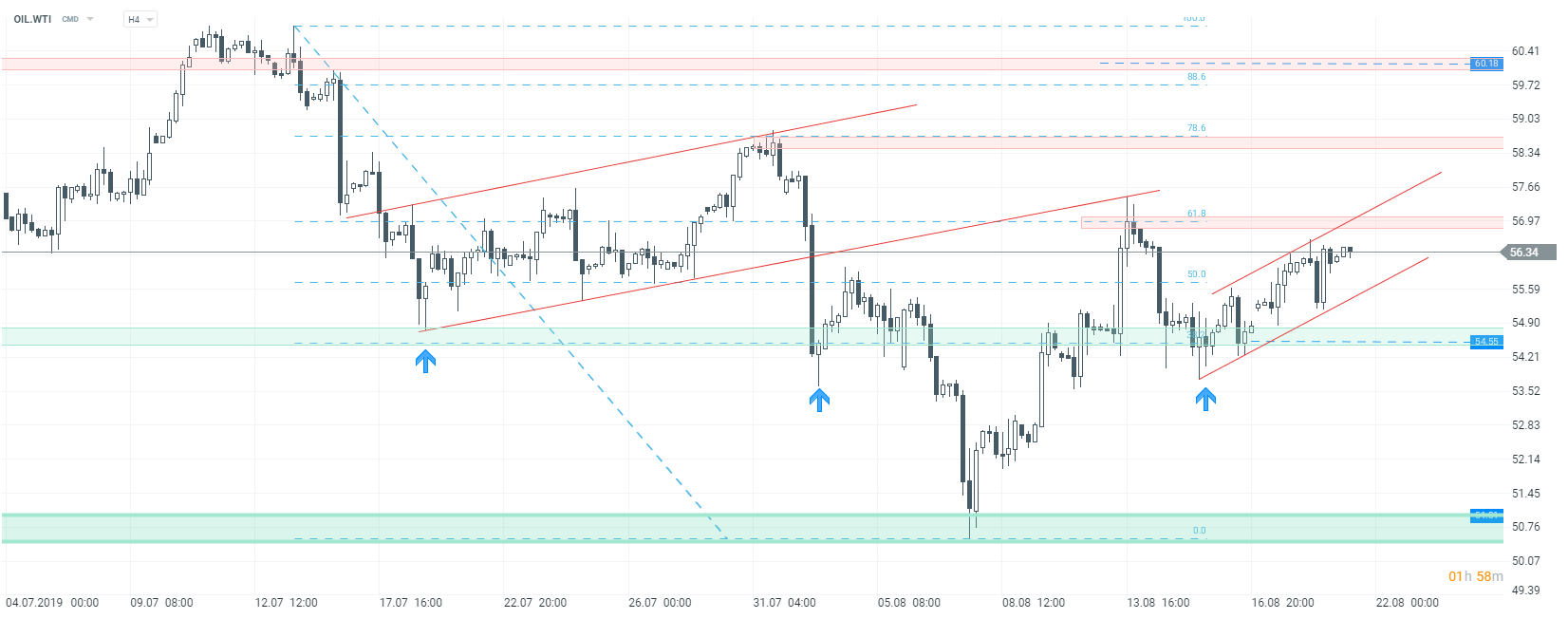 Notowania ropy WTI skutecznie wybroniły strefę wsparcia przy poziomie 54,60$. Aktualnie celem dla strony popytowej powinny być szczyty z 13 sierpnia, czyli okolice współczynnika 61,8%, który wynika z mierzenia na ostatniej fali spadkowej. Jeśli ruch w górę byłby silniejszy i poziom 57$ zostałby wybity, ruch w górę może przybrać na sile. Wtedy też kolejnym ważnym oporem jest strefa przy następnym zniesieniu Fibonacciego - 78,6%, gdzie znajdują się poziomy maksymalne z ostatniej sesji lipca - 58,8$. Lokalnie kurs utrzymuje się w kanale wzrostowym, co przechyla prawdopodobieństwo na stronę kupujących. O większych spadkach na rynku ropy naftowej można myśleć dopiero w momencie powrotu poniżej wspomnianego wsparcia przy 54,6$. Warto dodać, że dziś o godzinie 16:30 poznamy stan zapasów ropy naftowej, dlatego też zmienność w godzinach popołudniowych może być większa.