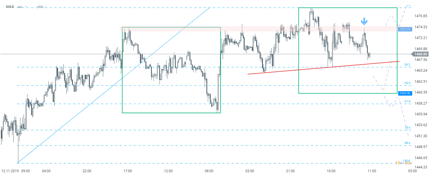 Patrząc na interwał M30 na złocie, cena ma wyraźny problem z pokonaniem oporu przy 1474,15$. Wczoraj co prawda doszło chwilowego wyjścia powyżej, jednak jak się później okazało - wybicie było fałszywe. Strefa zaznaczona kolorem różowym odgrywa w dalszym ciągu ważną rolę, rynek ponownie odbił się od tego miejsca dziś po godzinie 9:30. Dodatkowo patrząc nieco szerzej, można dostrzec szeroką formację głowy z ramionami. Wybicie linii szyi zaznaczonej kolorem czerwonym, powinno doprowadzić do pogłębienia przeceny. Wtedy też kolejnym wartym uwagi wsparciem będzie dolne ograniczenie układu Overbalance (zielone prostokąty). Aby myśleć o scenariuszu wzrostowym, cena musiałaby wrócić powyżej 1474$. Poziom ten odgrywa kluczową rolę również na wyższym przedziale czasowym, dlatego jego pokonanie może przyczynić się do przyspieszenia wzrostów.
