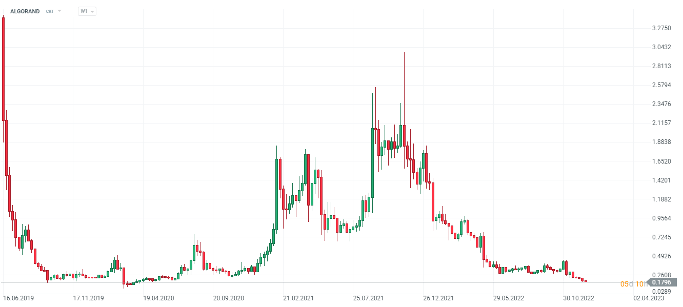 Kryptowaluta Algorand traci mimo, że w ramach strategii marketingowej, deweloperzy kilka miesięcy temu nawiązali współpracę z FIFA. Dzięki temu logo Algorand widoczne było podczas niektórych z największych meczów w rozgrywkach mundialu w Katarze. Trendy spowolnienia aktywności w zdecentralizowanych finansach okaząły się jednak ważyć więcej od mundialu i spowodowały spadek cen: