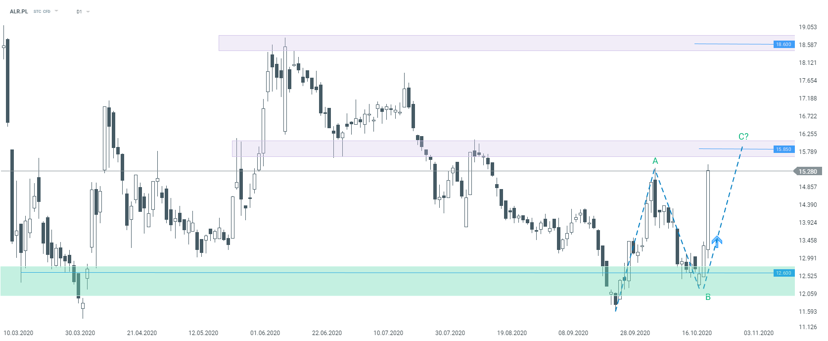 Patrząc na sytuację techniczną, obserwujemy silne odreagowanie po ostatnich spadkach. Kurs odbił się od kluczowej strefy wsparcia przy poziomie 12,6 zł. Jeżeli sentyment się utrzyma, istnieje szansa na tak strefy oporowej przy 15,85 zł.