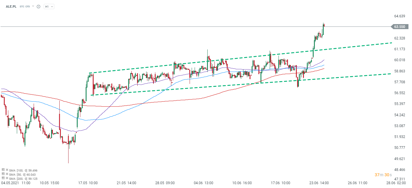 Allegro zyskuje dzisiaj 2,13% i jednocześnie przyczynia się w największym stopniu do wzrostu wartości indeksu WIG. Najstarszy indeks warszawskiego parkietu WIG osiągnął wczoraj najwyższe zamknięcie w historii, natomiast dzisiaj najwyższe dzienne poziomy, pokonując te ostatnie rekordy z 2018 roku. W ostatnim czasie obserwujemy bardzo pozytywne nastroje w stosunku do spółek z sektora e-commerce.