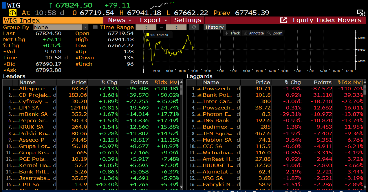 Najbardziej pozytywny wpływ na notowania indeksu WIG ma dzisiaj Allegro. Jak widać w Top 15 spółek obserwujemy raczej te największe spółki. Źródło: Bloomberg