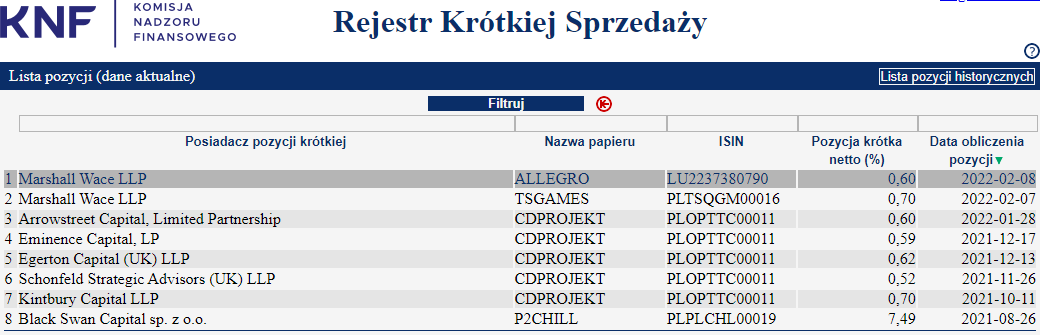 Aktualna lista pozycji krótkich (powyżej 0,2% kapitału podstawowego). Źródło: Komisja Nadzoru Finansowego (KNF)