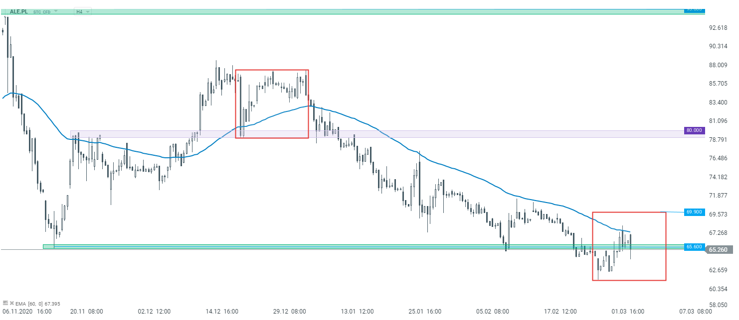 Kurs spółki zniżkuje dziś o ponad 2% pomimo mocnych wyników za 4Q, które przewyższyły oczekiwania rynku. Cena znajduje się w ostatnich dniach w pobliżu kluczowego poziomu 65,60 zł, który jeszcze do niedawna można było uznać za ważne wsparcie. Od początku stycznia obowiązuje trend spadkowy. Patrząc na interwał H4, sentyment mógłby zmienić się po dynamicznym przebiciu w górę poziomu 69,90 zł. Źródło: xStation5