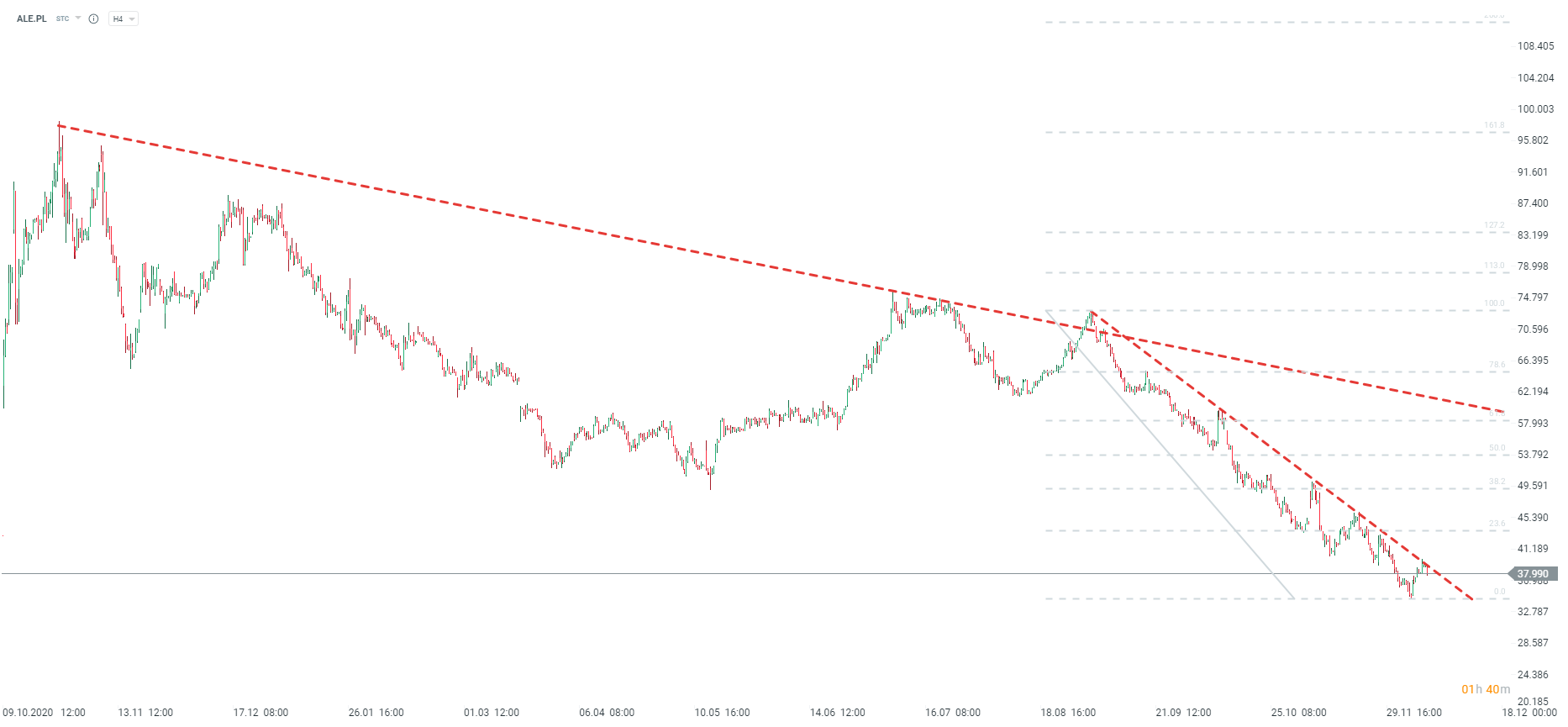 Patrząc na wykres widzimy odbicie od spadkowej linii trendu,który rozpoczął się początkiem września. Akcje w pewnym momencie traciły od wrześniowego szczytu ponad 50%, natomiast obecnie strata od historycznych szczytów wynosi nieco ponad 60%.