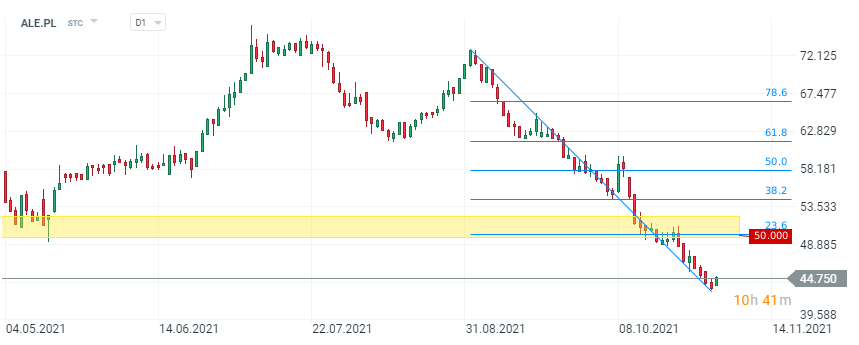 Wykres akcji spółki Allegro (ALE.PL), interwał D1. Obecnie walory spółki próbują odbijać się po ostatniej fali przeceny. Dzisiejsze wzrosty sięgają 3,06%, jednak z technicznego punktu widzenia, dopiero potwierdzone wybicie górą ze strefy oporu przy poziomie 50 zł za akcję mogłoby dać bykom nadzieje na kontynuację wzrostów. Trend spadkowy jest ciągle utrzymywany, i o jego zanegowaniu, mogłoby dopiero świadczyć przebicie wspomnianego poziomu 50 zł, gdzie znajduje się także zniesienie 23,6% Fibonacciego. Źródło: xStation 5