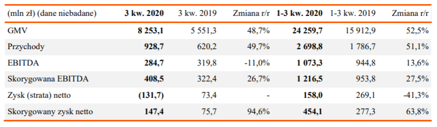 Wartość sprzedanych produktów (GMV) w trzecim kwartale 2020 wyniosła 8 253 mln PLN (+48,7% r/r). Przychody wzrosły o 49,7% r/r do 928,7 mln PLN (choć konsensus PAP zakładał 940 mln PLN). Nieznacznie poniżej oczekiwań wypadła też skorygowana EBITDA, która sięgnęła 408,5 mln PLN (konsensus: 412,8 mln PLN). Grupa zanotowała 131,7 mln PLN straty netto wobec 73,4 mln PLN zysku netto przed rokiem. Jak podkreślono, na poniesioną stratę wpłynęły jednorazowe wydatki związane z przygotowaniem IPO oraz koszty m.in. związane z programami motywacyjnymi, przyznaniem akcji pracownikom i refinansowaniem kredytów.