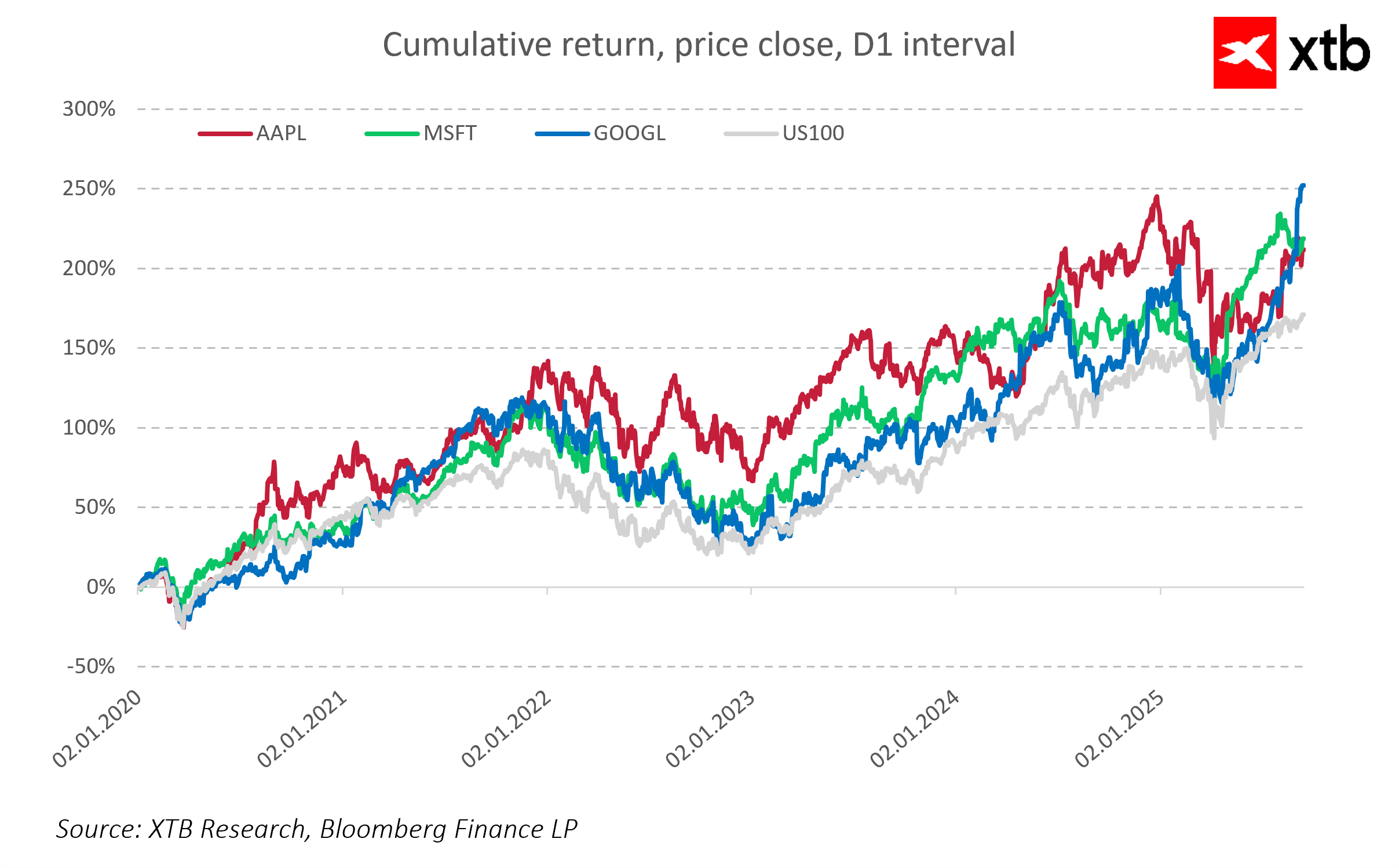 Na uwagę zasługuje również wyjątkowo silna stopa zwrotu dla akcjonariuszy. Od początku 2020 roku skumulowana stopa zwrotu przekroczyła 250%, co plasuje spółkę na bardzo zbliżonym poziomie do Microsoftu i Apple. Wszystkie trzy spółki wyraźnie przewyższyły indeks Nasdaq 100, którego skumulowany wzrost wyniósł nieco ponad 150% w tym samym okresie. Pokazuje to, że Alphabet nie tylko nadąża za konkurencją, ale konsekwentnie buduje swoją pozycję jako jeden z głównych beneficjentów transformacji cyfrowej.