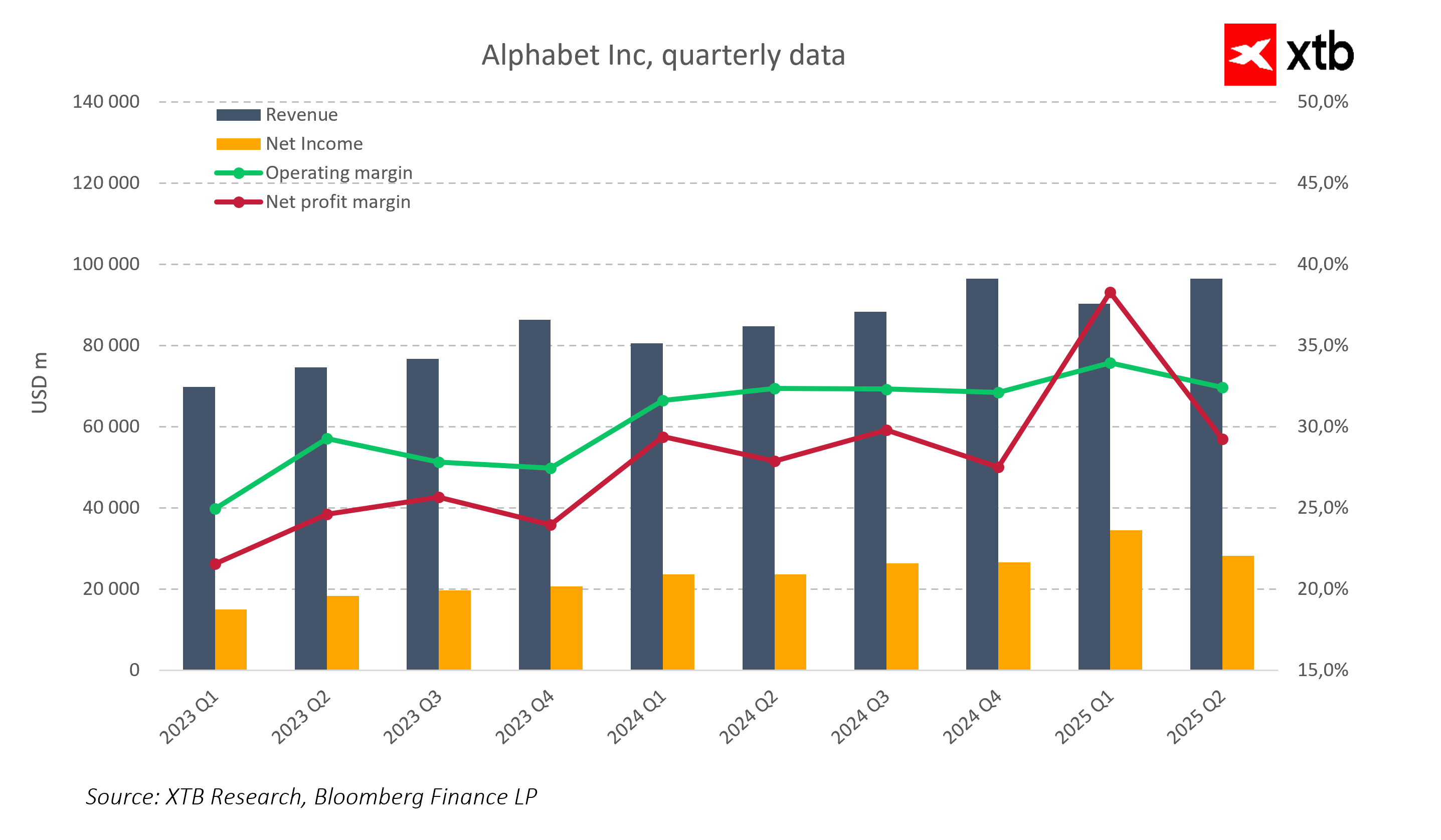 W okresie od początku 2023 roku do drugiego kwartału 2025 roku przychody Alphabetu wzrosły z około 70 miliardów dolarów do ponad 95 miliardów dolarów. Jednocześnie zysk netto zwiększył się z niespełna 20 miliardów do niemal 35 miliardów dolarów w pierwszym kwartale 2025 roku, co stanowiło rekordowy wynik w historii spółki. W drugim kwartale utrzymał się na wysokim poziomie, oscylując w okolicach 30 miliardów dolarów. Zwraca uwagę także systematyczny wzrost rentowności.