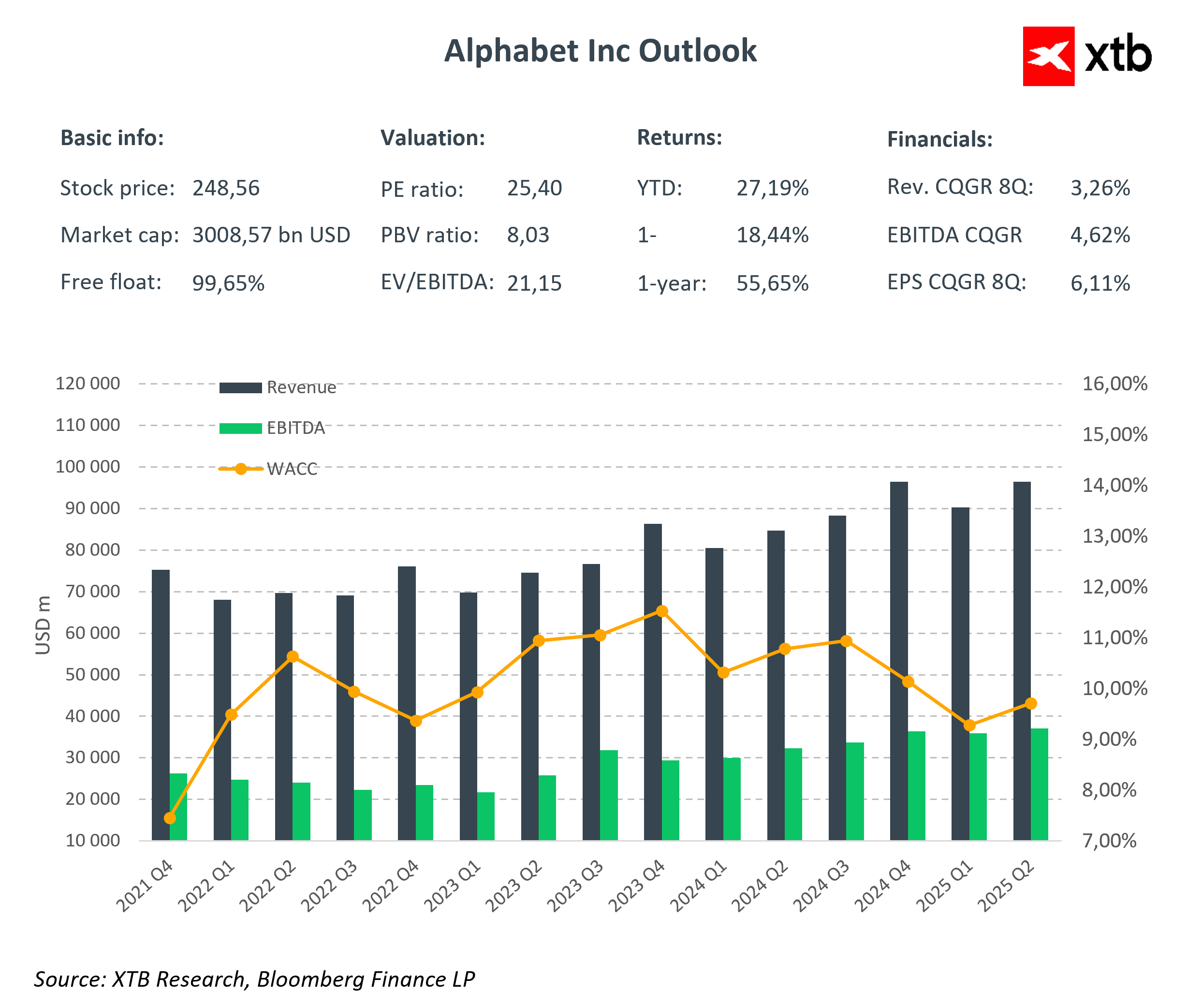 Drugim fundamentem rekordowej wyceny są konsekwentnie rosnące wyniki finansowe Alphabetu w ujęciu kwartalnym oraz dynamiczny rozwój usług opartych na sztucznej inteligencji. Szczególne znaczenie miał dalszy postęp w rozwoju modelu językowego Gemini, który coraz częściej postrzegany jest jako realna alternatywa dla ChatGPT. Alphabet skutecznie integruje Gemini z kluczowymi produktami i usługami, w tym z wyszukiwarką, pakietem biurowym Workspace, reklamą i rozwiązaniami chmurowymi.