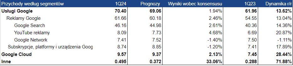 Wyniki Alphabetu za 1Q24. Źródło: XTB Research, sprawozdanie spółki