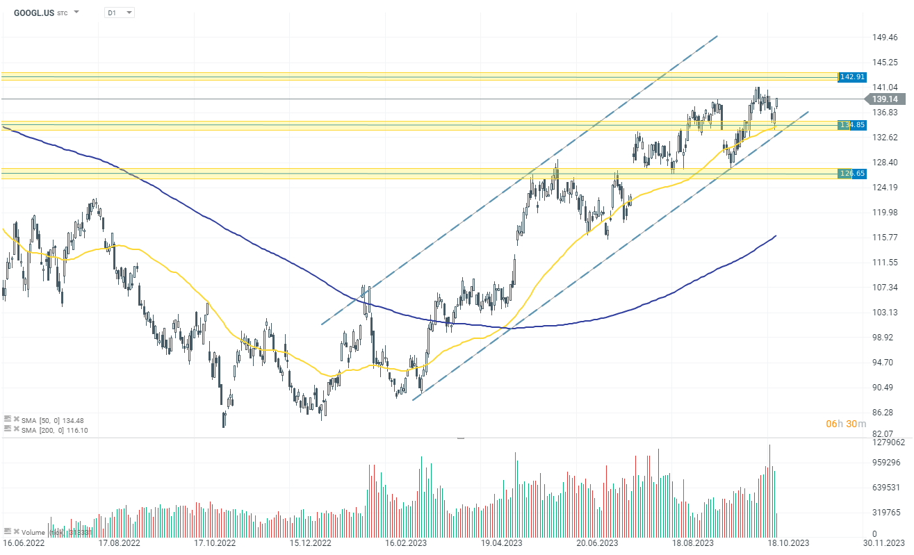 Akcje Google (GOOGL.US) zwyżkowały dziś o 1,71% przed publikacją wyników, które opublikowane będą po zamknięciu rynku. Alphabet znajduje się w kanale wzrostowym od początku 2023 r., po utworzeniu lokalnego potrójnego dna na poziomie około 90 dolarów. Przez ostatnie dwa dni akcje spółki zyskiwały, odbijając się od wsparcia na poziomie 134 dolarów. Jeśli raport okaże się tak dobry, jak oczekuje rynek, możemy spodziewać się retestu kolejnych poziomów oporu na poziomie 142-143 dolarów. W przeciwnym razie należy spodziewać się zwiększonej presji sprzedaży i potencjalnego retestu poziomów 134-135 dolarów. Źródło: xStation5