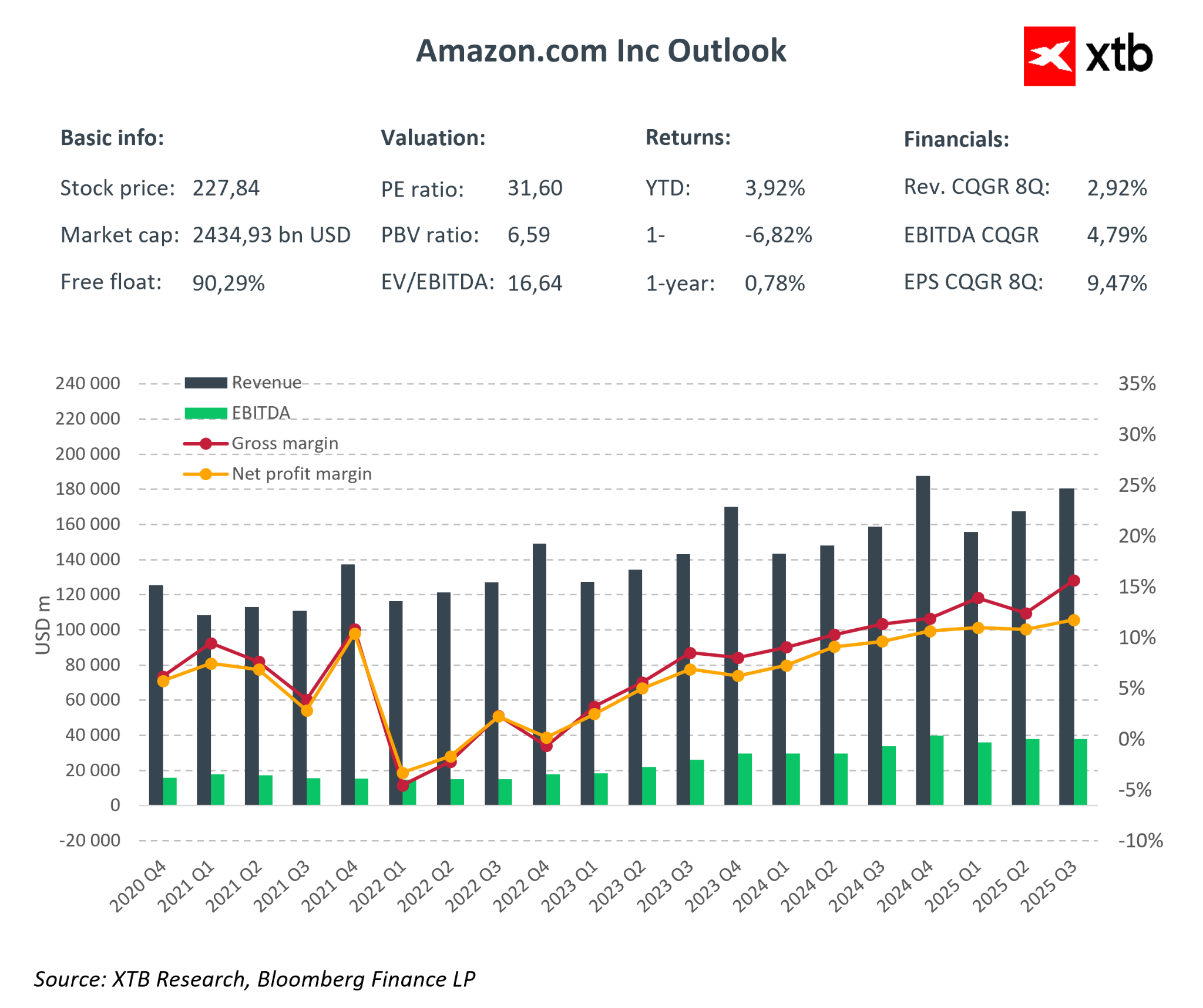 Amazon znacząco zwiększa swoje zaangażowanie w Indiach, dołączając do Microsoftu i Google w budowie globalnego hubu AI i chmury. To impuls wzrostowy dla przychodów Amazona, ale wiąże się z wysokimi nakładami kapitałowymi i ryzykiem regulacyjnym. Warto zauważyć, że w tym roku spółka odnotowała stosunkowo niską stopę zwrotu, jeśli porównamy ją do innych gigantów technologicznych oraz głównych indeksów, takich jak S&P 500 czy Nasdaq 100.