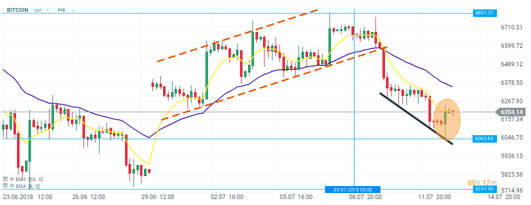 BITCOIN ospale odbił się od dołków z tego tygodnia. Kryptowaluta na chwilę przełamała poziom 6200 dolarów w dniu dzisiejszym. Wirtualna waluta, podobnie jak inne, bierze oddech. Obecnie, Bitcoin próbuje przebić się przez 8-okresową średnią kroczącą na wykresie H4 (źółta linia). Źródło: xStation5