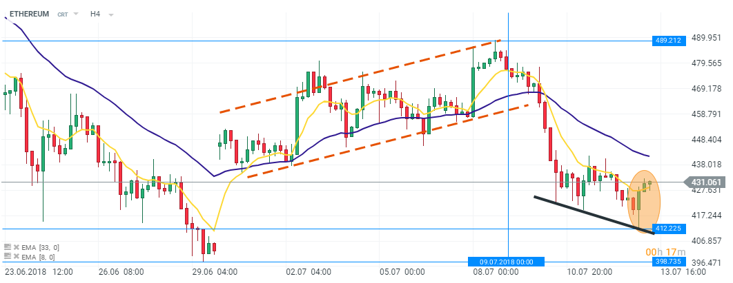 ETHEREUM, kryptowaluta z drugą największą kapitalizacją, podobnie jak inne ważne wirtualne waluty uspokaja się. Obecnie znajdujemy się nieco powyżej 430 dolarów. Ethereum oscyluje wokół poziom 430 dolarów od wtorku. Wydaje się, że traderzy muszą poczekać na bardziej wyraźne impulsy. Źródło: xStation5