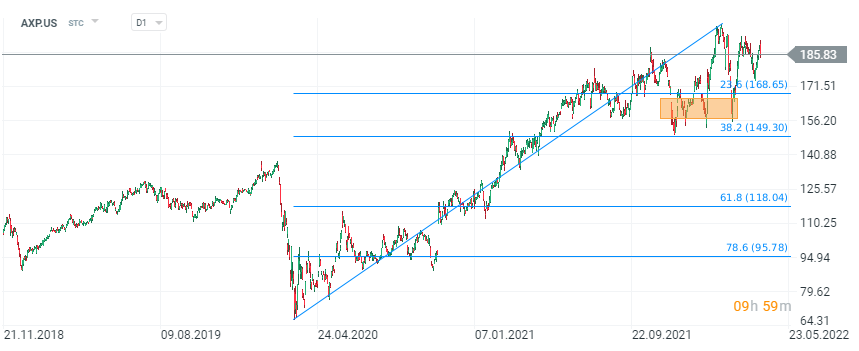 Akcje American Expres AXP.US, interwał D1. Spółka wyraźnie odrobiła potężne spadki spowodowane wybuchem pandemii, które zamoroziła rynek podróży i sprawiła że spora część ludzi nie wydawała pieniędzy. Firma zdążyła w znacznym stopniu odrobić spadki spowodowane rosyjskim atakiem na Ukrainę, a jej cena nie została poważnie dotknięta spadkiem sentymentu inwestorów wokół spółek technologicznych notowanych na NASDAQ. Poziomy między 23.6 a 38.2 zniesieniem Fibonacciego stanowią obecnie mocne wsparcie w razie osunięcia się ceny spółki, cena kilkukrotnie odbijała się od granicy w okolicach 150 USD za akcję, która może okazać się solidną bazą dla dalszych wzrostów. Źródło: xStation5