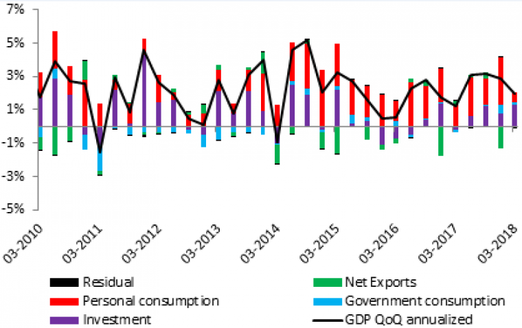 Amerykański wzrost gospodarczy w pierwszym kwartale 2018 roku okazał się słabszy niż wcześniej sądzono. Podczas gdy oczekiwano wzrostu o 2,2% faktyczny wzrost wyniósł 2%. Jako powód takiego stanu rzeczy można podać mocny spadek wydatków gospodarstw domowych, których wzrost wyraźnie spowolnił po mocny czwartym kwartale 2017 roku.