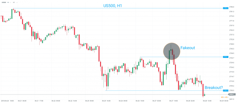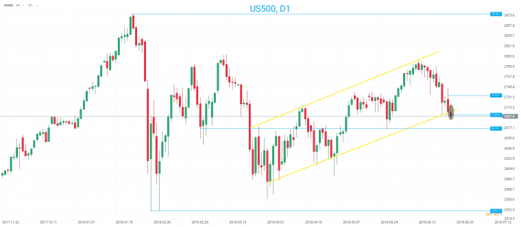 Na rynkach akcji widzimy kontynuację przeceny. Indeks US500 przebił się poniżej poziomu 2700 pkt wybijając tym samym miesięczne minima. Źródło: xStation5