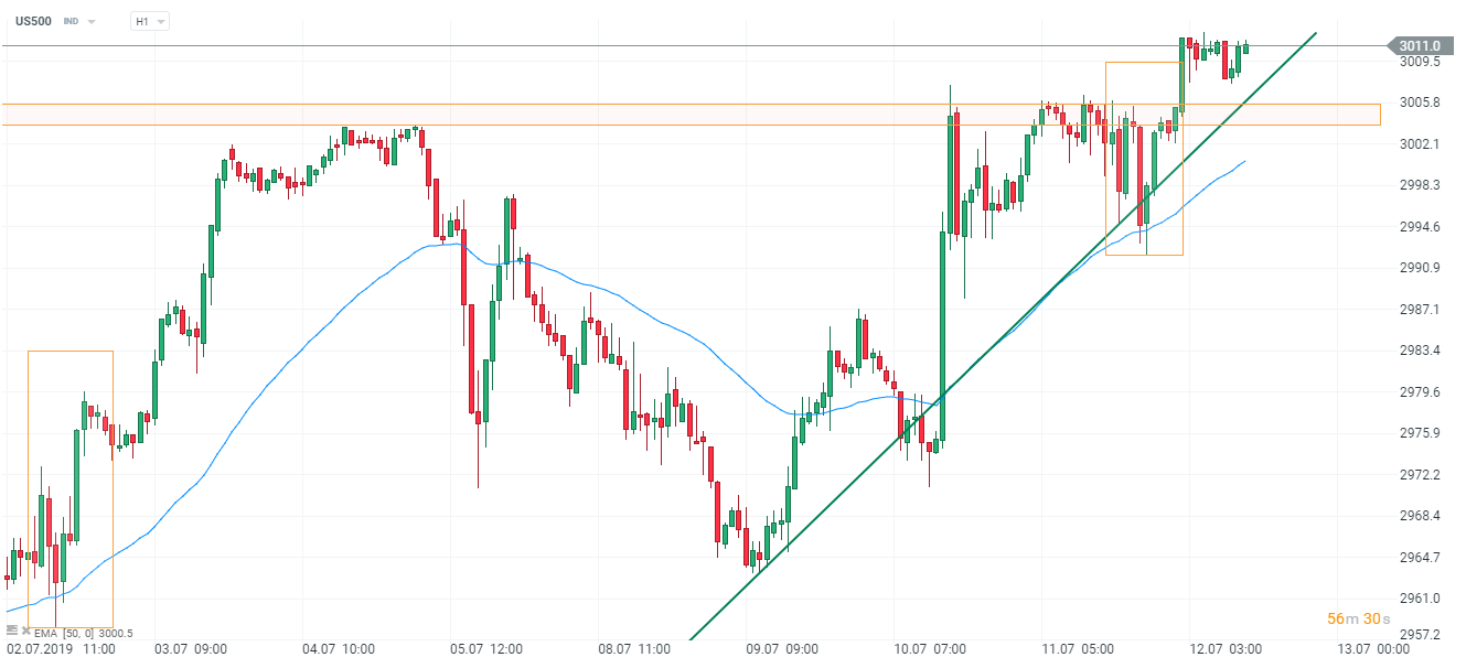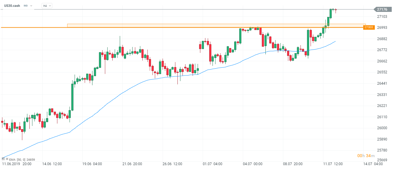 Czwartkowa sesja zakończyła dzień rekordowym entuzjazmem inwestorów. Zarówno indeks Dow Jones Industrial Average jak i S&P 500 odnotowały swoje nowe historyczne maksima. Dla przypomnienia, US30 (DJIA fut.) przebił granicę 27 tys punktów i zakończył sesję powyżej tego poziomu, zaś S&P500 wzrósł o ok. 0,2% i również przełamał psychologiczna barierę 3000 pkt, jednakże zakończył dzień minimalnie poniżej tej granicy.