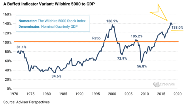 Innym wskaźnikiem, który pokazuje sygnały ostrzegawcze jest jeden z ulubionych wskaźników legendarnego Warrena Buffeta. Relacja indeksu Wilshire 5000 do PKB jest kwestią często poruszaną przez Wyrocznię z Omaha i to na tyle często, że część osób nazywa ten wskaźnik jego imieniem. Wskaźnik stara się zestawić wycenę wszystkich amerykańskich spółek z PKB największej gospodarki świata, przy czym zakłada się, że skrajne odczyty często poprzedzają odwrót i ruch powrotny w kierunku 100%. Poprzedni najwyższy odczyt przy poziomie 136,9% miał miejsce tuż przed szczytem bańki internetowej w 2000 roku. W chwili obecnej wskaźnik znajduje się na poziomie 138%. Trzeba zaznaczyć, że ten wskaźnik powinno się odczytywać długoterminowo, tak więc ta skrajna wartość wcale nie musi oznaczać, że krach czai się za rogiem. Niemniej, jednak pokazuje skalę tego jak drogie są obecnie amerykańskie spółki.