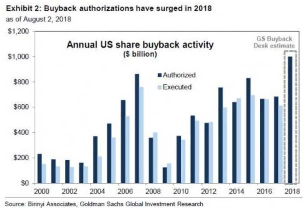 Goldman Sachs oczekuje, że wartość operacji skupu akcji własnych przez amerykańskie spółki w 2018 roku będzie wyższa od wartości z 2007 roku. Źródło: Birinyi Associates, Goldman Sachs Global Investment Research