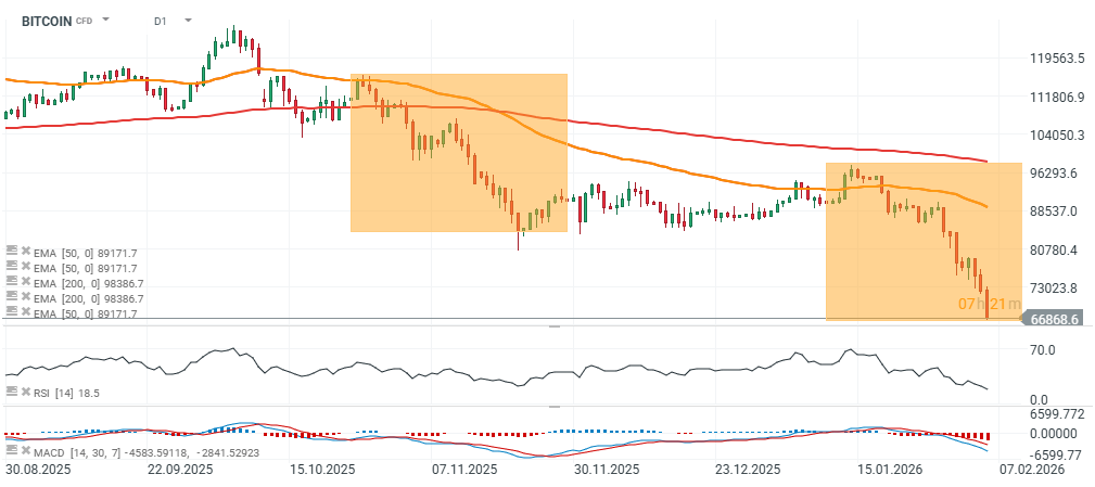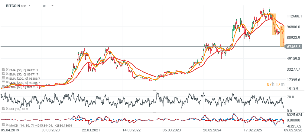 Bitcoin pogłębia dzisiejszą wyprzedaż i spada w kierunku 66,5 tys. USD, które stanowią potencjalnie silniejszą strefę wsparcia (to poziom szczytów z hossy 2021 roku). Wskaźnik RSI na interwale dziennym spadł do okolic 18 i świadczy o ekstremalnie rzadkim wyprzedaniu, a dodatkowe paliwo do odbicia może stanowić geometryczny układ korekty 1:1. W przypadku zrealizowania go i konsolidacji w pobliżu 66 - 70 tys. USD niewykluczony jest powrót w kierunku 75 tys. USD w horyzoncie kilku tygodni i ewentualny, kolejny impuls spadkowy o zbliżonym do aktualnego zasięgu, który mógłby kierować cenę kryptowaluty w strone 50 tys. USD, gdzie widzimy istotne wsparcia on-chain (m.in. Delta Price). Ewentualne odwrócenie trendu spadkowego mogłaby przyjść po wybiciu powyżej 90 tys. USD (EMA50, pomarańczowa linia).