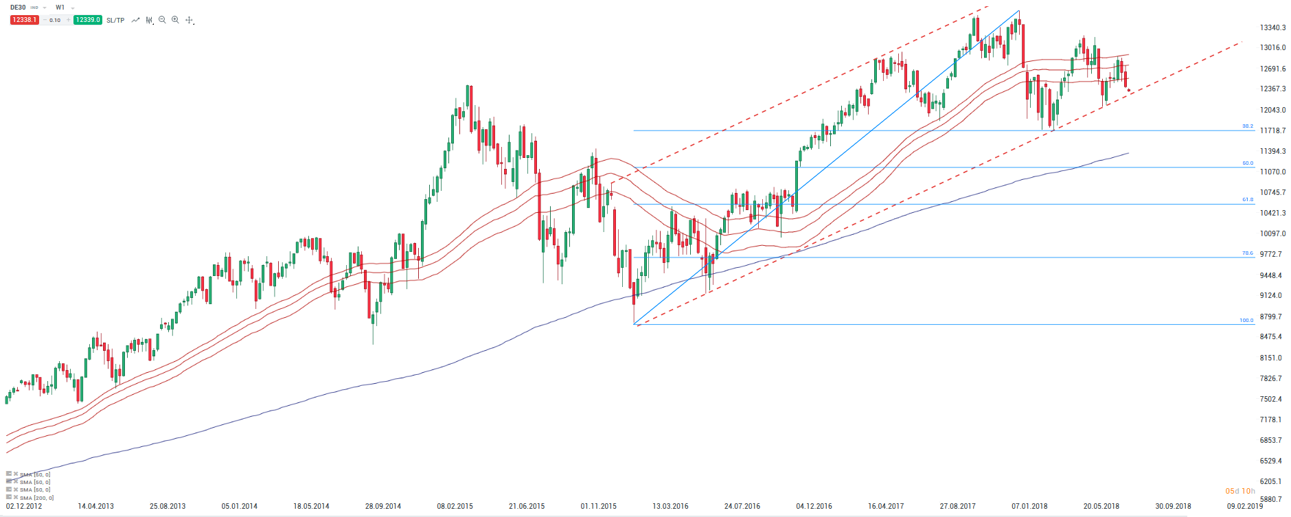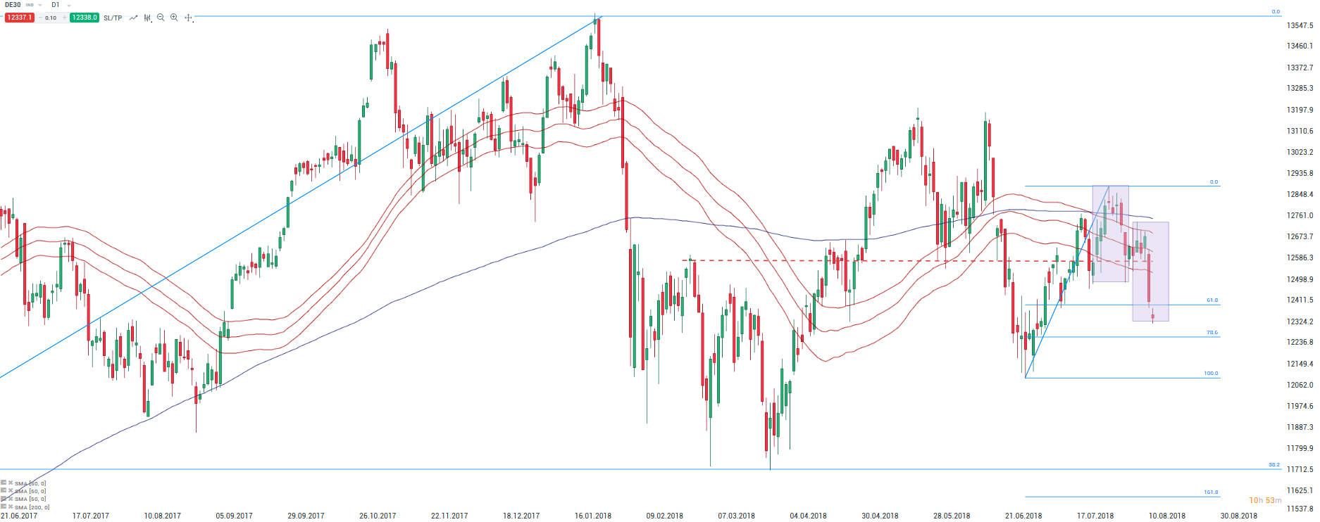 Ostatnie dni przyniosły silną przecenę europejskich parkietów. Głównym powodem były problemy w Turcji, które mogą mieć znaczenie dla sektora bankowego w Europie. Słabo zachowywał się niemiecki DAX, który w ujęciu tygodniowym ponownie zbliżył się w kierunku dolnego ograniczenia kanału wzrostowego. Powstrzymał on spadki pod koniec czerwca, lecz czy i tym razem zatrzyma on zapędy coraz śmielej radzącego sobie obozu niedźwiedzi? Tego nie wiemy, ale z pewnością sekwencja niższych szczytów, którą obserwujemy od początku tego roku jest pierwszym sygnałem ostrzegawczym dla strony kupującej. Dodatkowo w dalszym ciągu znajdujemy się poniżej kanału średnich 50-okresowych, a ostatni atak na ten poziom zakończył się fiaskiem.