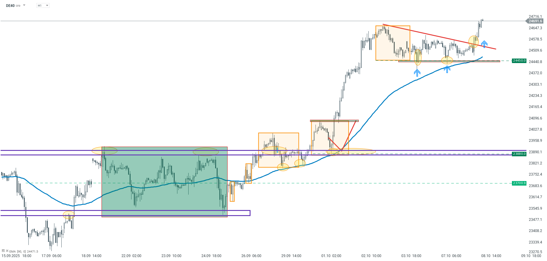 Na niższym interwale czasowym H1 kurs od połowy września pozostaje w wyraźnej tendencji wzrostowej. Ostatnie trzy lokalne korekty miały identyczny zasięg, co zostało zaznaczone pomarańczowymi prostokątami. Dolne ograniczenie ostatniego prostokąta zostało przetestowane dwukrotnie – mimo chwilowej konsolidacji, cena zdołała, zgodnie z oczekiwaniami z porannego webinarium, wybić się górą z formacji trójkąta i ustanowić nowy lokalny szczyt, co potwierdza utrzymujący się sentyment wzrostowy.Wydaje się, że dopiero trwały spadek poniżej poziomu 24 450 punktów mógłby zmienić układ sił na wykresie.