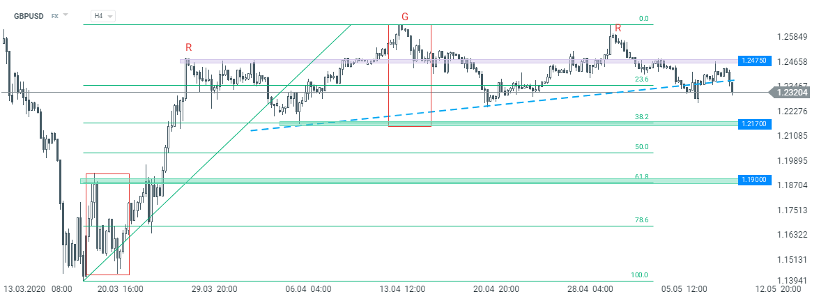Patrząc z kolei na funta brytyjskiego w ujęciu do dolara, w poniedziałek możemy obserwować wyraźne spadki (-0,75%). Na interwale H4 cały czas widoczna jest szeroka formacja głowy z ramionami, która może zapowiadać dalszą przecenę. Niemniej jeśli ruch będzie kontynuowany, należy zwrócić uwagę na wsparcie przy 1,2170, gdzie znajduje się dolne ograniczenie układu overbalance, miejsce to może być bronione przez kupujących. Oporem pozostaje z kolei strefa przy 1,2465, jej pokonanie będzie świadczyć o zanegowaniu wspomnianej struktury RGR.