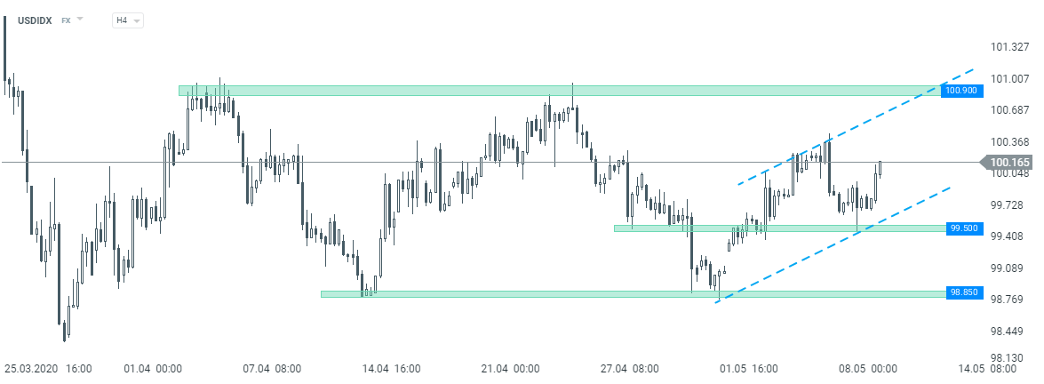 Patrząc z kolei na wykres indeksu dolara, widać trend boczny. Lokalnie notowania poruszają się w kanale wzrostowym, niemniej w szerszej perspektywie liczą się teraz dwie strefy. Kluczowy opór wypada przy 100.90, z kolei wsparcie znajduje się przy 98,85. Dopiero pokonanie któregoś z tych poziomów, mogłoby doprowadzić do większego ruchu trendowego. W krótkim terminie, jako podpora dla kupujących może działać także strefa przy 99,5, gdzie znajdują się chociażby piątkowe dołki.