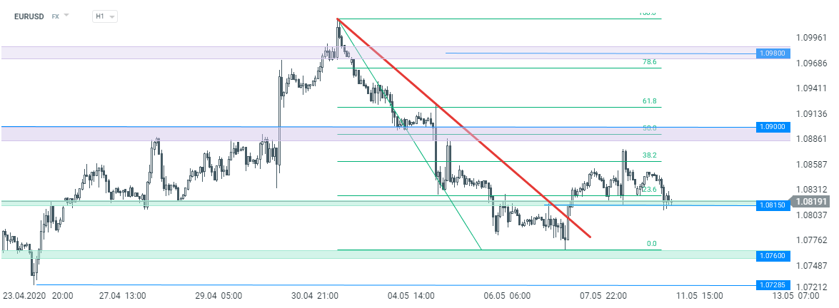 Jeśli chodzi o główną parę walutową, zmienność jest dziś najmniejsza wśród walut G8. Euro traci zaledwie 0,15% do dolara. Aktualnie kurs utknął na wysokości lokalnego wsparcia przy 1,0815, które wynika z wcześniejszych reakcji ceny. Jeżeli dojdzie do wybicia dołem, niewykluczony jest ruch w kierunku ostatnich dołków przy 1,0760. Jeżeli jednak poziom będzie broniony, możliwe będzie odbicie i wzrosty w kierunku oporu przy 1,0900.