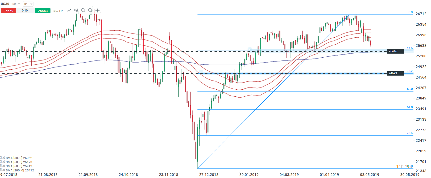 W ujęciu dziennym, indeks dotarł na piątkowej sesji w rejon strefy wsparcia w okolicy średniej 200-sesyjnej oraz zniesienia 23,6% (25500 pkt.). Ten poziom również w kolejnych dniach powinien działać stabilizująco na notowania US30. W przypadku jego wyłamania, kolejnym wsparciem będą okolice 24700 pkt., czyli zniesienie 38,6% oraz lokalne maksima z stycznia tego roku.