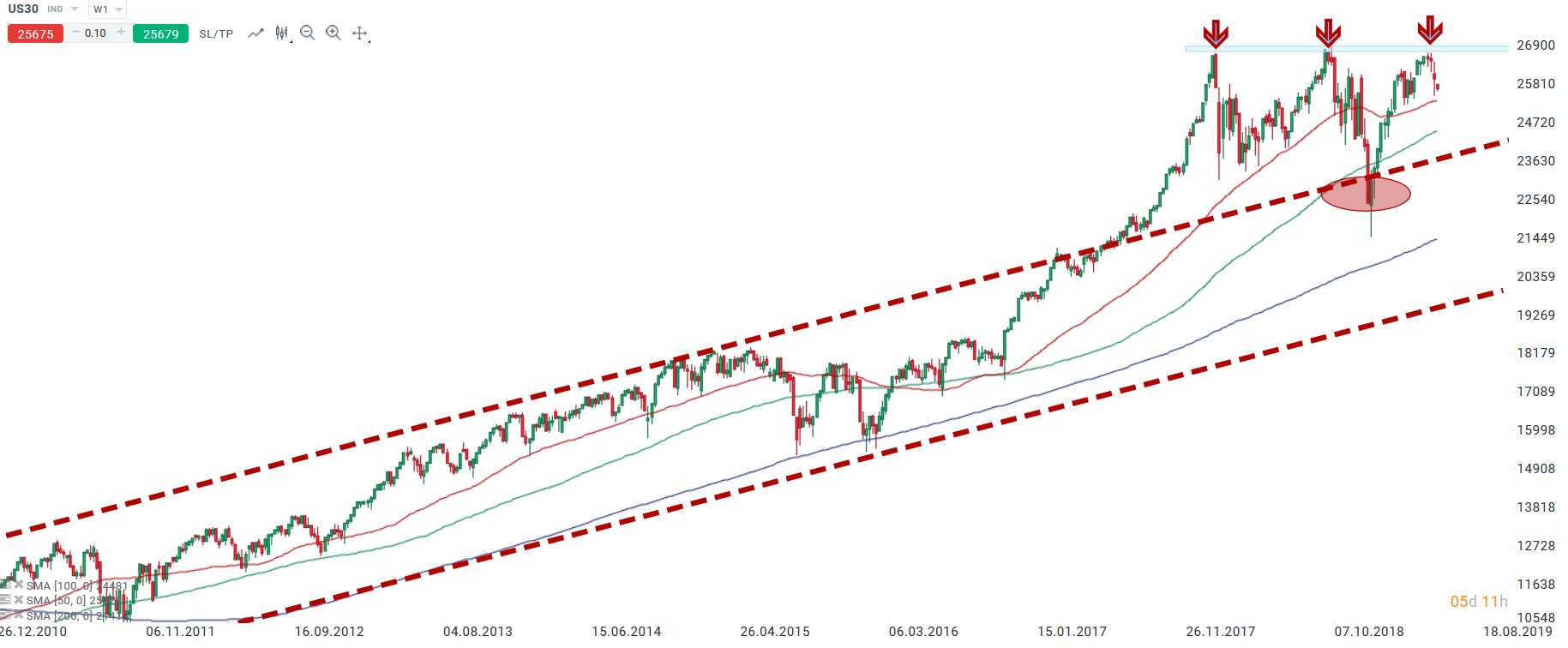 Napięcia handlowe powstrzymały wzrosty na światowych indeksach. O ile S&P500 (US500), jak i Nasdaq (US100) zdołały pokonać swoje historyczne maksima, to ta sztuka nie udała się w przypadku blue chipów - Dow Jones (US30). Benchmark zrzeszający największe spółki dotarł w ostatnich tygodniach ponownie do 27000 pkt. Ta bariera powstrzymywała wzrosty wcześniej już trzykrotnie. Taka mieszanka stwarza szansę do ponownego powrotu w rejon górnego ograniczenia kanału wzrostowego, który prowadził hossę w latach 2009-2017. Wygenerowanie długoterminowego sygnału sprzedaży na podstawie formacji potrójnego szczytu nastąpiłoby jednak dopiero po wybiciu grudniowych minimów.