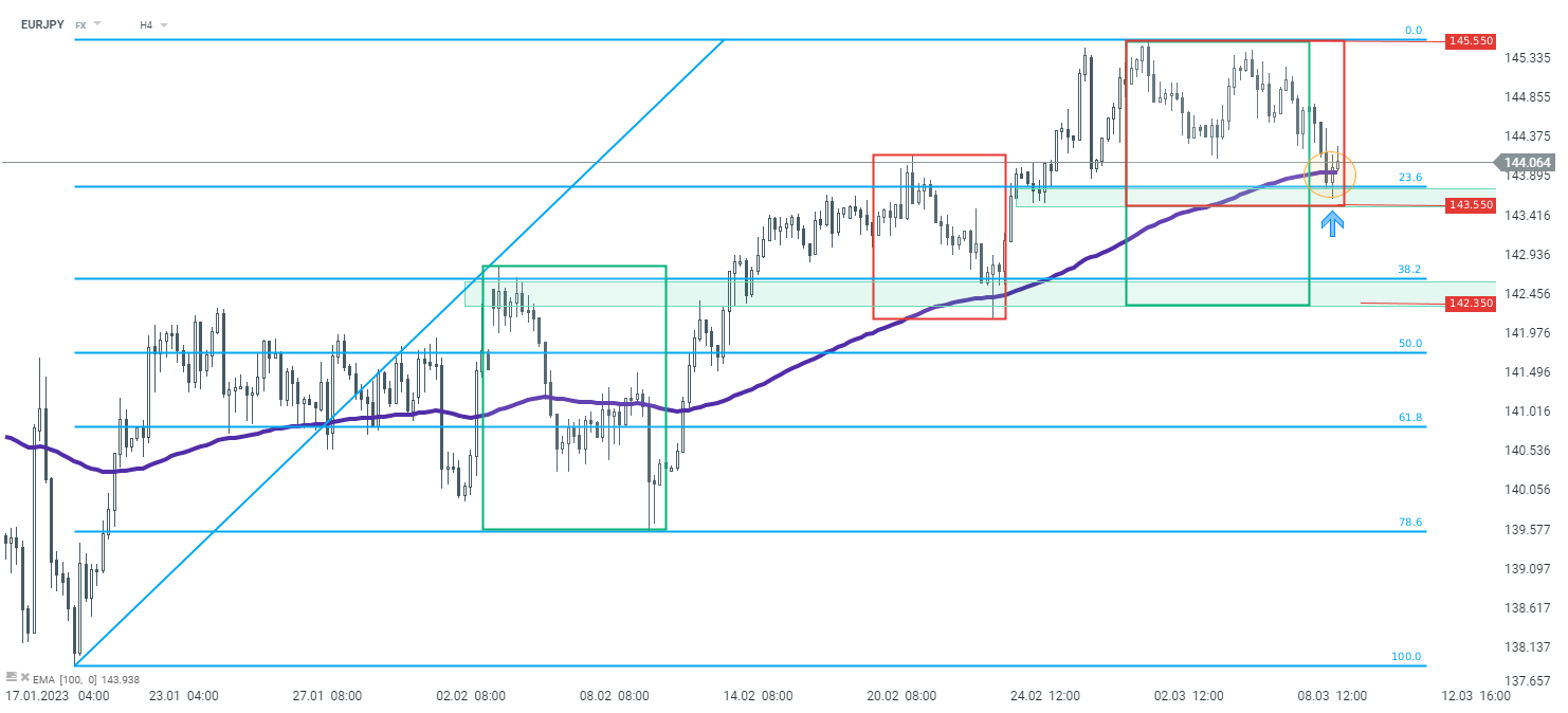Notowania EURJPY od pewnego czasu poruszają się w tendencji wzrostowej. Patrząc na interwał H4, ostatnia korekta spadkowa dotarła do ciekawego wsparcia. Strefa zaznaczona kolorem zielonym przy 143,55 wynika z wcześniejszych reakcji cenowych, dolnego ograniczenia lokalnego układu 1:1, oraz średniej EMA100. Jeśli kupujący zdołają utrzymać cenę powyżej, niewykluczone będzie wznowienie trendu wzrostowego. W przeciwnym razie, złamanie poniżej, może utorować drogę w kierunku kolejnego wsparcia przy 142,35, która wynika z większej geometrii 1:1, oznaczonej zielonym prostokątem.