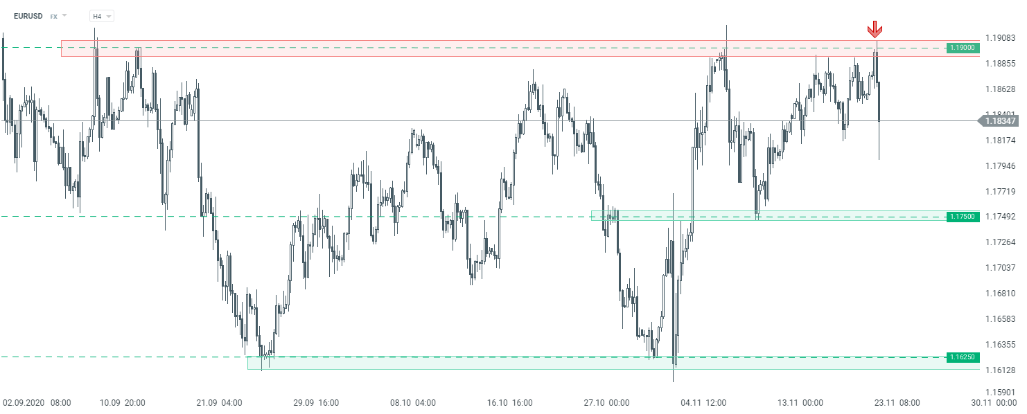 Notowania głównej pary walutowej od pewnego czasu poruszają się w tendencji bocznej. Patrząc na interwał H4, kurs ponownie odbił się od strefy oporowej przy okrągłym poziomie 1,19 USD. Aktualnie niewykluczony jest więc ruch w kierunku wsparcia przy 1,1750. Jeżeli poziom ten zostałby pokonany, przecena mogłaby sięgnąć ostatnich minimów przy 1,1625. Niemniej należy pamiętać, że każdy kolejny test wspomnianego oporu przy 1,19 - zwiększa ryzyko wybicia górą. Dlatego też w przypadku odzyskania przewagi przez kupujących, kolejny atak może zakończyć się jego przebiciem.