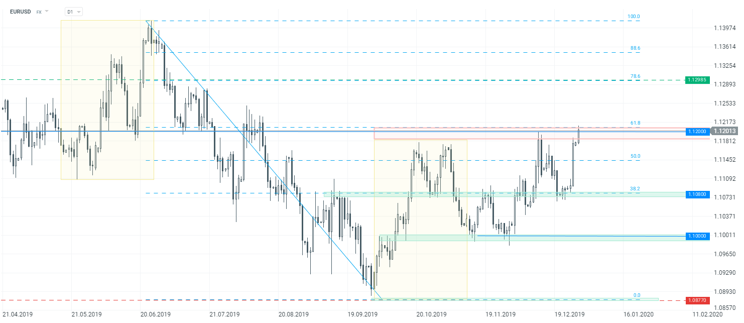 W ostatnim czasie notowania EURUSD utrzymywały się w szerokim zakresie wahań pomiędzy 1,12, a 1,10. Niemniej pod koniec ubiegłego tygodnia wzrosty wyraźnie przyspieszyły, co doprowadziło do ponownego testu strefy oporowej przy 1,1200. Aktualnie kurs znajduje się na wysokości szczytów z sierpnia tego roku. Jeżeli dzisiejsza świeca D1 zamknie się powyżej zaznaczonego kolorem różowym obszaru, wybicie stanie się faktem, wtedy też celem dla kupujących będzie ruch w kierunku następnego współczynnika Fibonacciego czyli 78,6%. Z drugiej strony, ponowne przejęcie inicjatywy przez sprzedających może doprowadzić do powrotu do zakresu konsolidacji. Okolice okrągłego poziomu 1,1200 powinny być więc istotne w tym tygodniu.