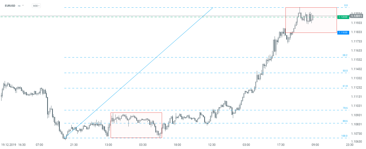 Jeśli chodzi o niższy interwał czasowy - M30, dominują wzrosty. Aktualnie ruch znacznie wyhamował , niemniej tendencja pozostaje zwyżkująca. Intraday kluczowym wsparciem jest poziom 1,1134, gdzie znajduje się dolne ograniczenie układu 1:1. Dopiero jego zanegowanie może doprowadzić do zmiany sentymentu na spadkowy.