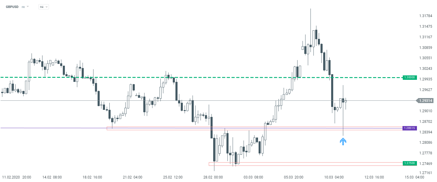 Dzisiejszy ruch właściwie nie zmienia układu sił na wyższym przedziale czasowym, gdzie na GBPUSD nie widać zdecydowanego trendu. Pomimo dużej zmienności brakuje określonego trendu. Patrząc na interwał H4, notowania zareagowały o poranku na wysokości wsparcia przy 1,2850, poziom pozostaje istotny. Z kolei jako opór należy traktować okolice okrągłego poziomu 1,30, gdzie rynek reagował chociażby 25 lutego, a także wcześniej w historii. Z jednej strony obniżka stóp procentowych powinna osłabiać funta, a z drugiej mówi się o tym, że Fed w najbliższym czasie zdecyduje się na kolejne cięcia, co mogłoby pogrążyć dolara. Sytuacja jest dynamiczna, niemniej jak widać horyzontalne poziomy wsparcia i oporu sprawdzają się, dlatego też przy w najbliższym czasie należy brać je pod uwagę.