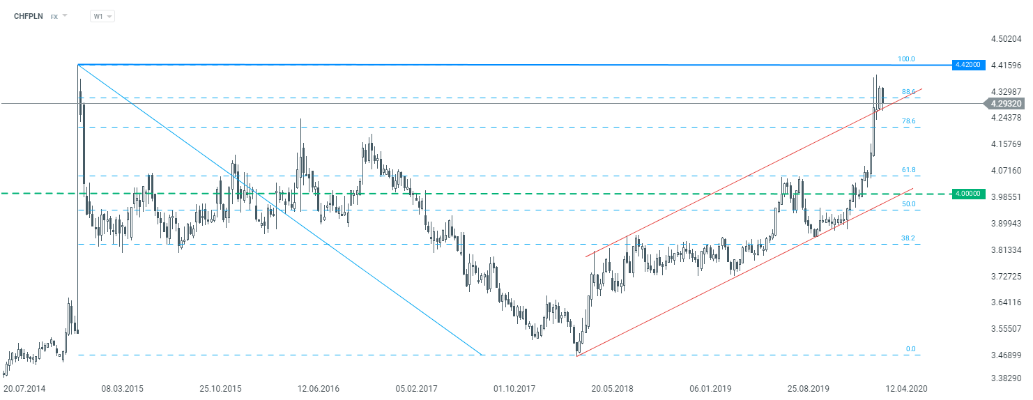 W przypadku franka szwajcarskiego spójrzmy na interwał tygodniowy. Pomimo, że w ostatnim czasie świeca W1 pokazała przewagę podaży, tak kolejny tydzień przyniósł negację i aktualnie rynek utknął mniej więcej na wysokości górnego ograniczenia kanału wzrostowego. W średnim terminie trend wciąż jest niekorzystny dla PLN, dlatego niewykluczony jest atak na historyczne maksima z 2015 roku, kiedy SNB uwolnił kurs franka. Aby myśleć o spadkach, notowania musiałyby wrócić do wspomnianego kanału trendowego.