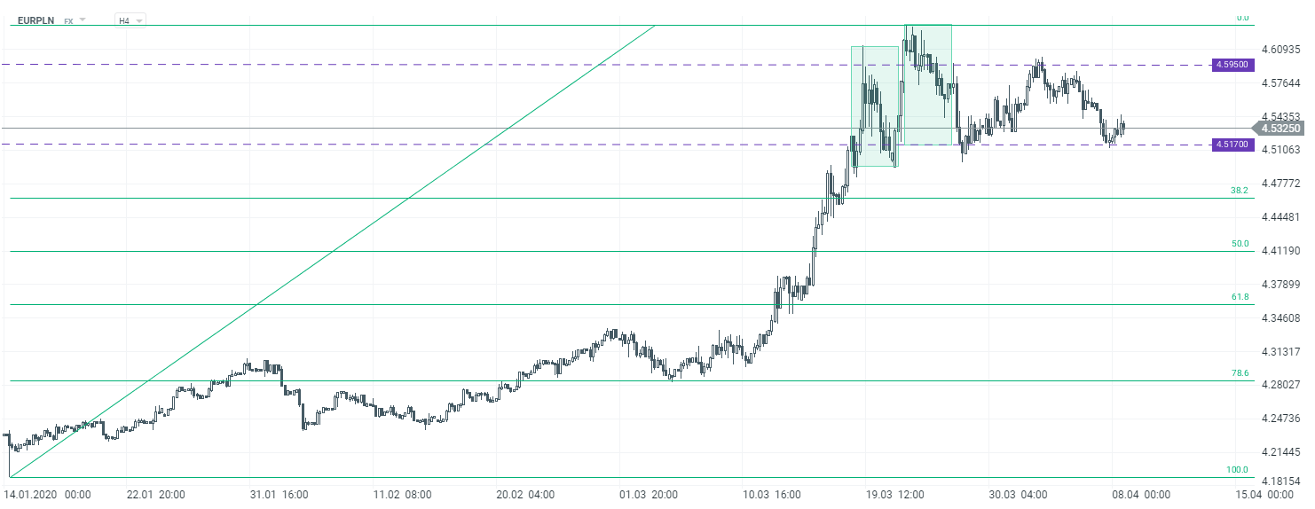Sytuacja na EURPLN wygląda podobnie do tej na GBPPLN. W ostatnim czasie mieliśmy do czynienia z identycznym odcinkami spadkowymi, jednak kupujący nie zdołali wybić nowego szczytu. Lokalnie możliwy jest więc ruch boczny pomiędzy poziomem 4,5170, a 4,5950. Wydaje się, że dopiero wybicie w jedną ze stron, może przyczynić się do wygenerowania większego ruchu trendowego. Jeśli korekta spadkowa się pogłębi, jako kolejne poziom wsparcia należy traktować współczynniki Fibonacciego wyznaczone na ostatniej fali wzrostowej.