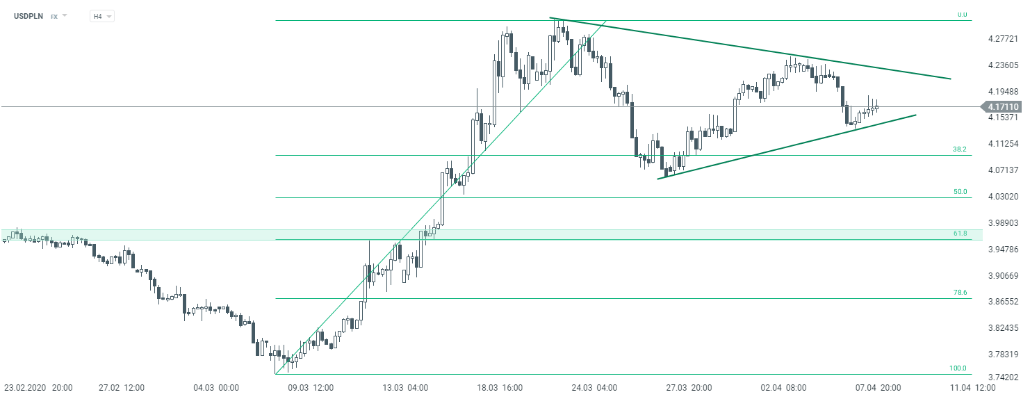 Sytuacja na dolarze do złotego wygląda chyba najmniej technicznie. Ostatnia fala wzrostowa co prawda wyhamowała, jednak w tej chwili ciężko określić dalszy kierunek. Z jednej strony jesteśmy dość wysoko, a z drugiej ostatnia korekta miał ponad 24 gorsze, dlatego też dalsza wędrówka na wyższe poziomy nie jest wykluczona. Lokalnie, na interwale H4 można wyznaczyć formację trójkąta. Wybcie górą lub dołem powinno dać sygnał w krótkim terminie.