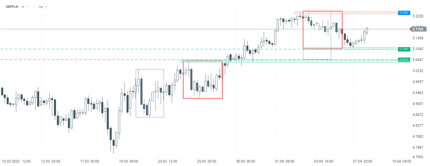Na początek spójrzmy na wykres funta brytyjskiego. W ubiegłym tygodniu para walutowa GBPPLN znalazła się na poziomach nie widzianych od grudnia 2016 roku. Niemniej po weekendzie przewagę szybko przejęła strona podażowa, co doprowadziło do cofnięcia na 13 groszy. Patrząc na interwał H4, trend wzrostowy jest jednak utrzymywany. Wczorajsze spadki dotarły do wsparcia przy 5,1050 zł, skąd prawdopodobnie rozpoczął się kolejny impuls wzrostowy. Celem dla strony popytowej może być w tej chwili poziom 5,2360 zł. Z kolei o większych spadkach można myśleć dopiero w momencie powrotu poniżej poziomu 5,0670 zł.
