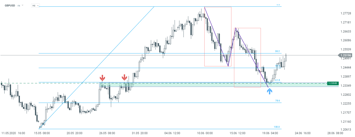 Zgodnie ze scenariuszem przedstawionym pod koniec ubiegłego tygodnia, kurs GBPUSD odbił się od kluczowego wsparcia przy 1,2350. Przypominając, miejsce to wynikało z geometrii na układzie korekty prostej (równość odcinków spadkowych) oraz strefy sekwencji, która pokrywała się także z mierzeniem 61,8% Fibonacciego ostatniej fali wzrostowej. Licząc od dołka, ruch w górę ma już ponad 170 pipsów. Jednak czy para walutowa na dobre wróciła już do wzrostów? Sprawdźmy gdzie znajdują się najbliższe kluczowe opory.
