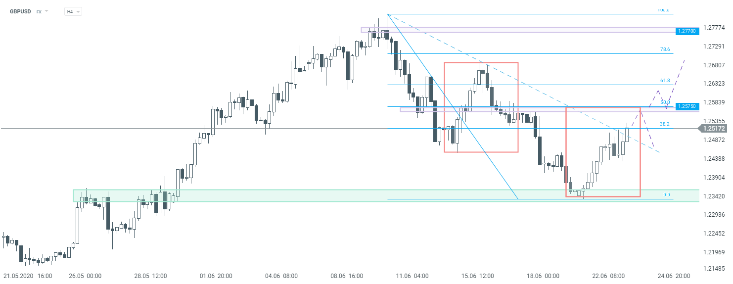 Zgodnie z założeniami teorii fal Elliotta, po wykonaniu korekty prostej, należy oczekiwać kontynuacji wzrostów i ataku na nowe maksima, niemniej zanim to nastąpi należy zwrócić uwagę na kluczowy opór przy 1,2570. Miejsce to wynika z położenia współczynnika 50% ostatniej fali spadkowej oraz górnego ograniczenia lokalnego układu 1:1. W przypadku pojawiania się tutaj sprzedających, niewykluczone jest kolejne zejście i atak na wspomnianą wcześniej strefę wsparcia przy 1,2350. Z drugiej strony, wybicie poziomu 1,2575 górą, powinno doprowadzić do przyspieszenia wzrostów. Wtedy też w zasięgu będzie nawet poziom 1,2770.