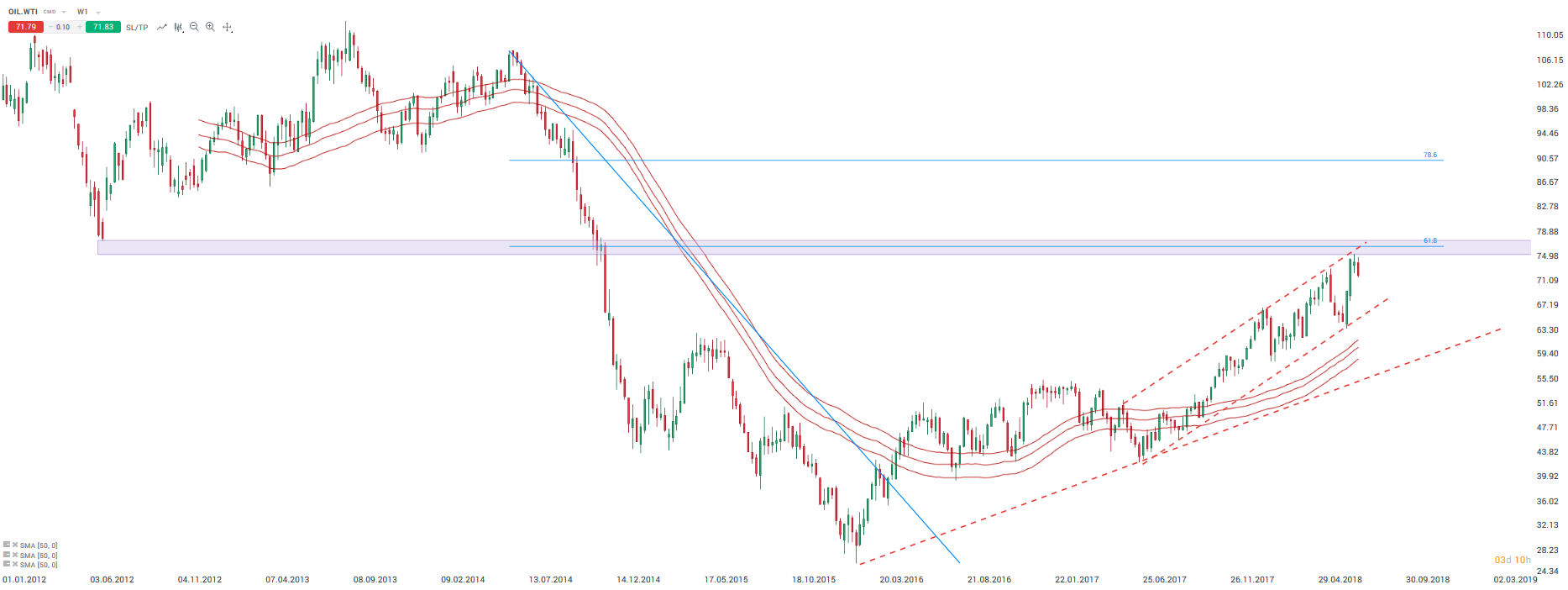 Ropa Brent (OIL) ponownie wchodzi w obszar kanału średnich 50-okresowych. Źródło: xStation5.